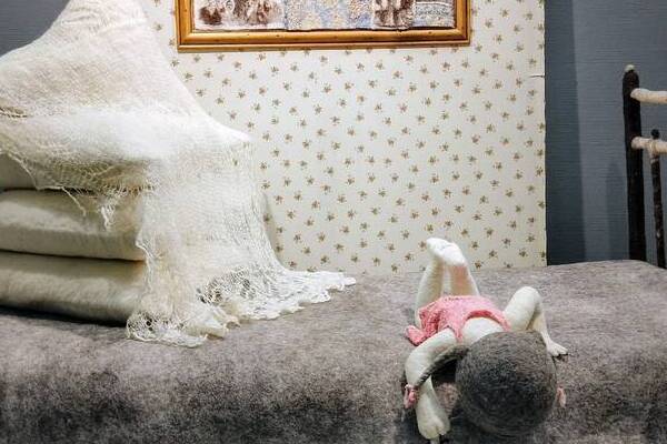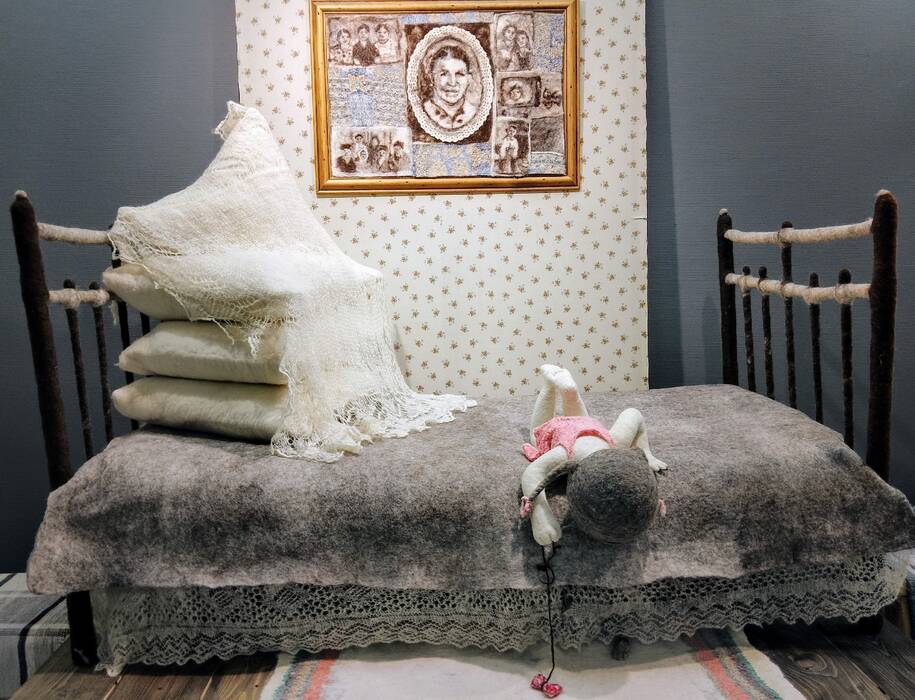 На выставку Ирины Андреевой «Узелки на память» в Музее-усадьбе П. И. Чайковского я попала случайно. И поразилась: в двух залах выставочного комплекса развëрнута целая история детства глазами героини – маленькой девочки. Пророщенный в стаканах лук, домашние цветы, занавески, покрывала, заправленная по моде наших бабушек кровать, уютные шкафчики, бельë, сохнущее на верëвке, пельмени, банки с молоком и даже коза – милые приметы быта, так хорошо знакомые старшему поколению. Уютно, красиво, волнующе и необычно, потому что все эти реалистичные предметы сотворены … из войлока!